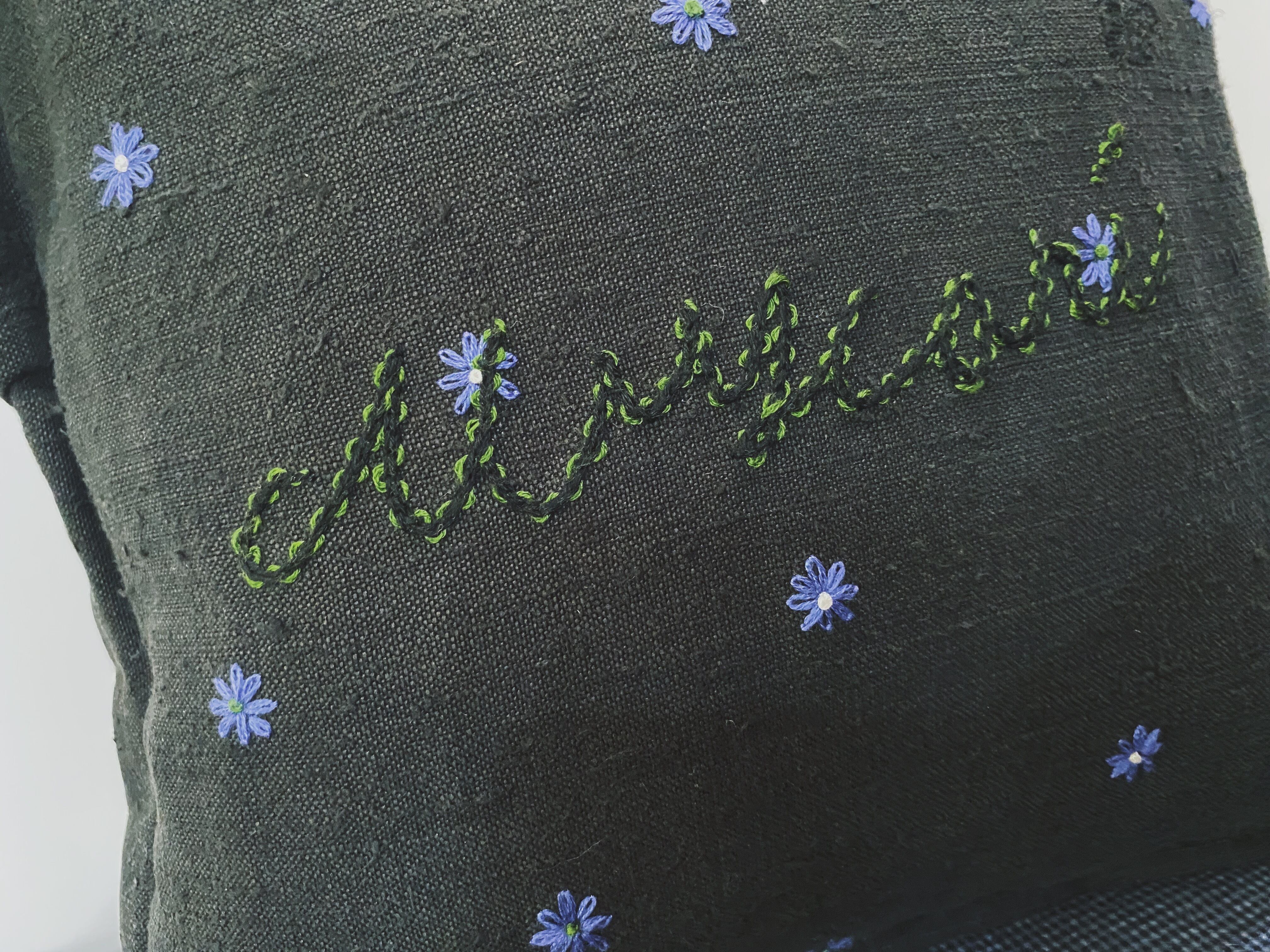 花の名はすべて手刺繍、お部屋やベッドサイドのポイントになるようなデザインに。