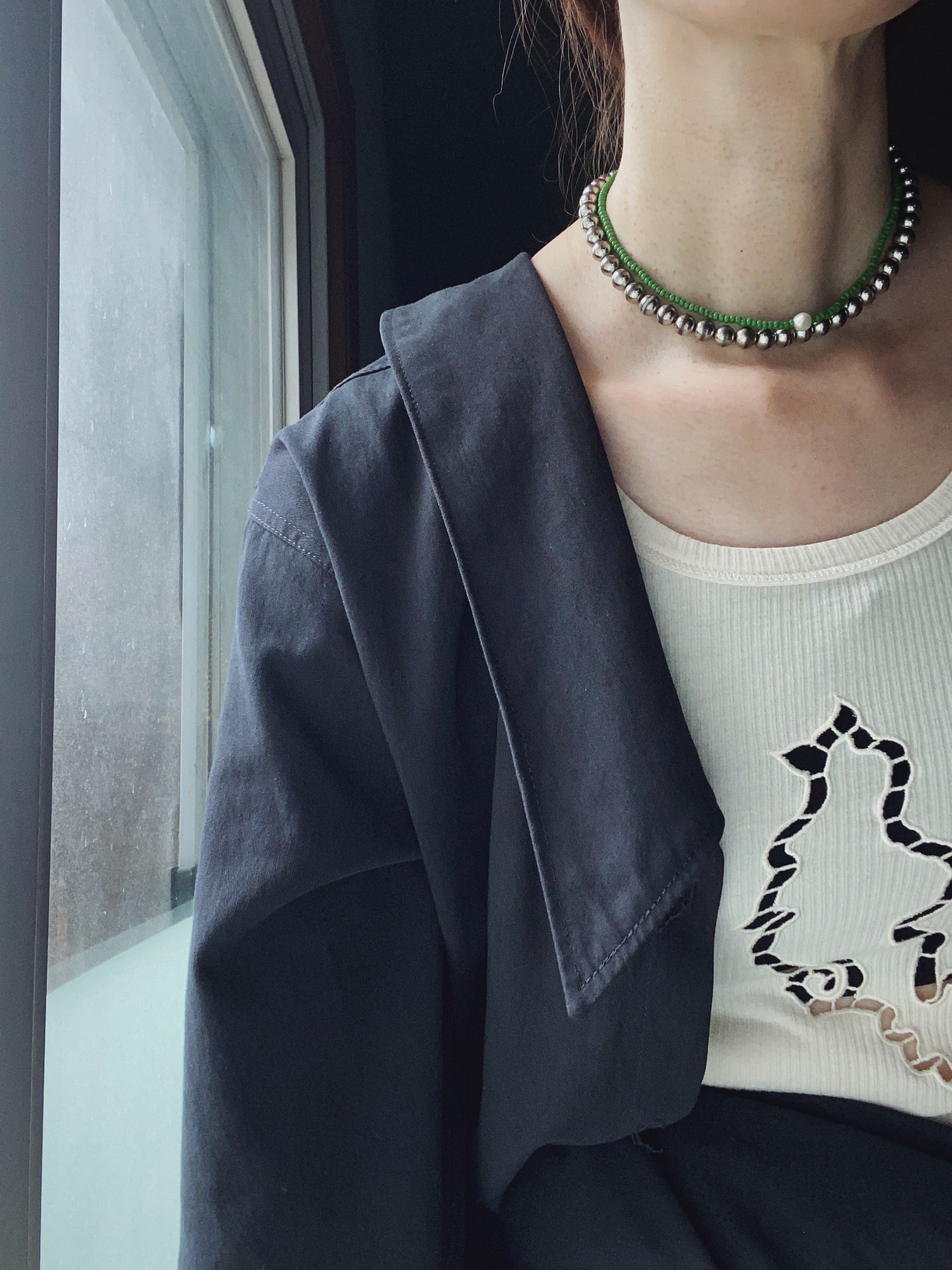 華奢なチェーンのネックレスにも、無骨なタイプのネックレスにもどちらにも合わせやすい一本です。