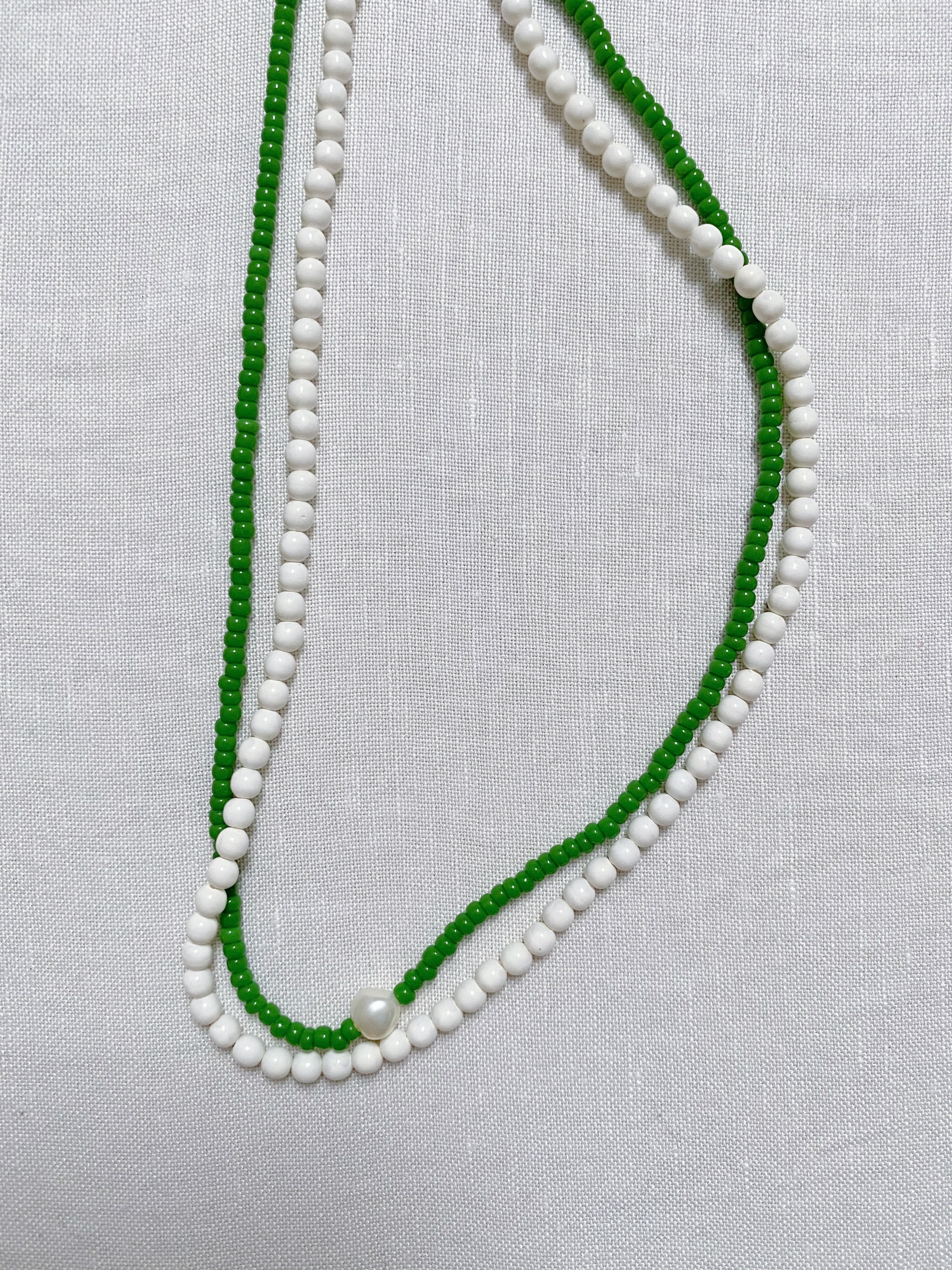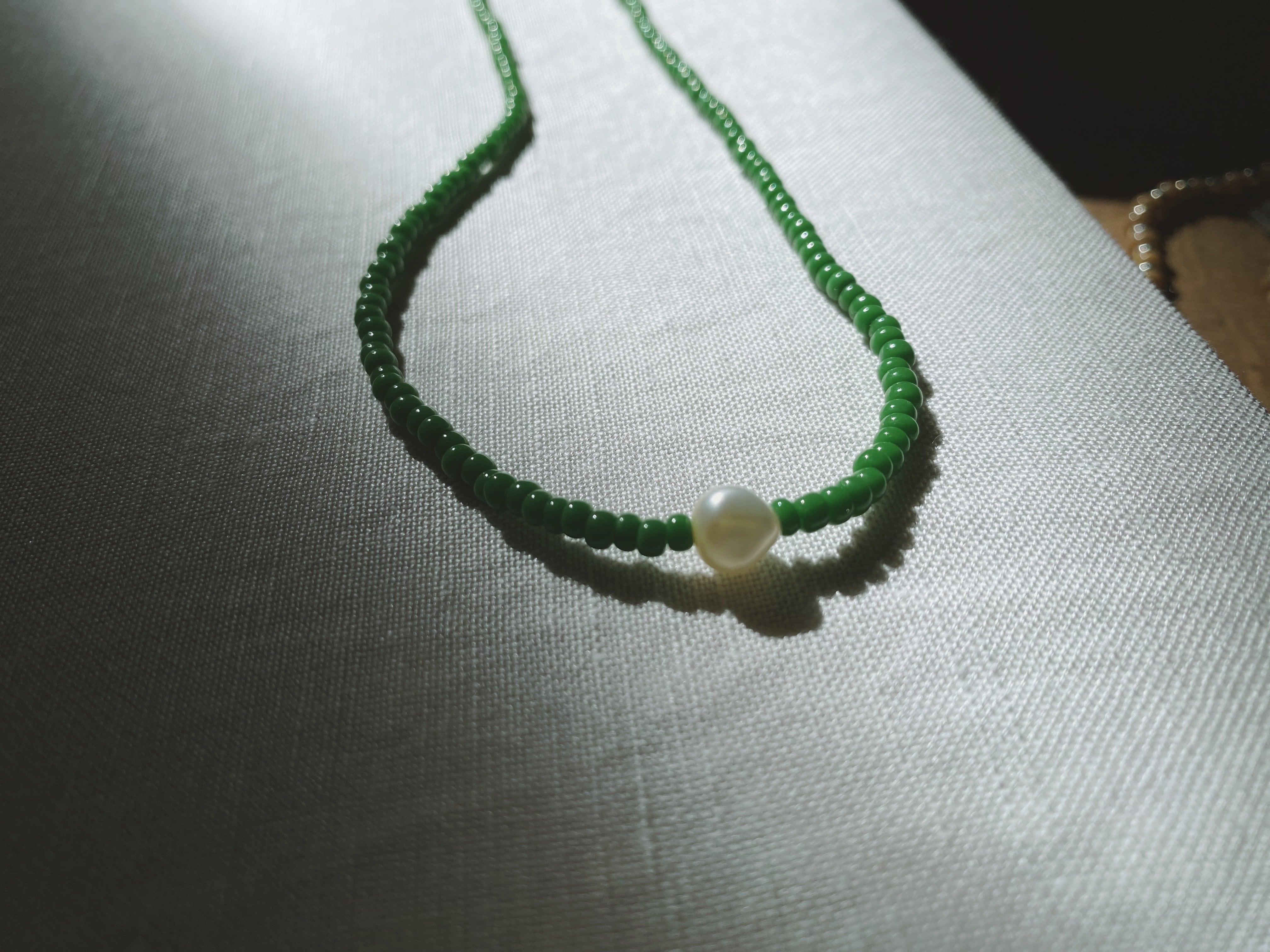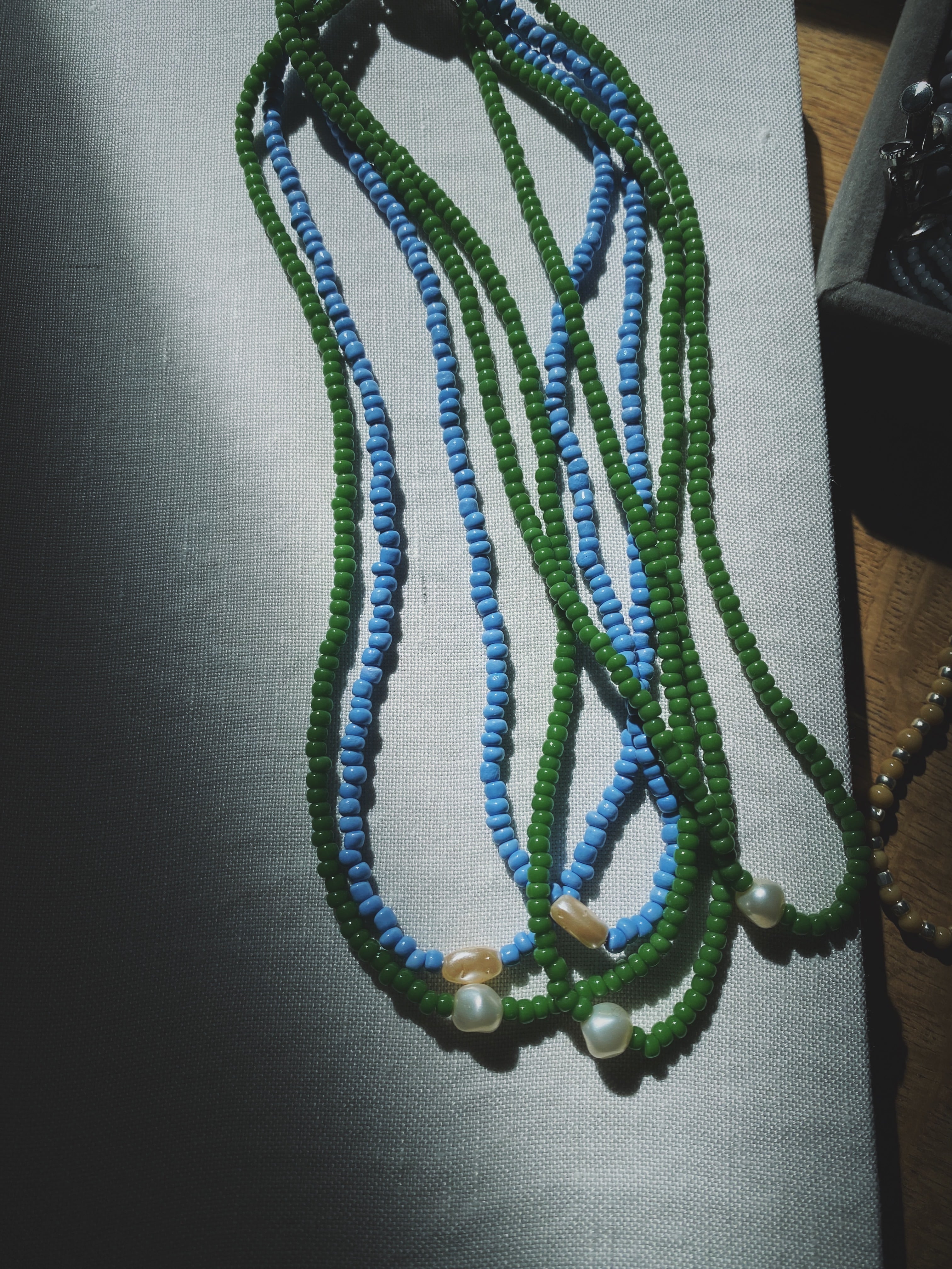 ジャパンビンテージ、とても状態の良いガラスのシードビーズを使用。小さい粒々のネックレスはセンターにパールが一粒。