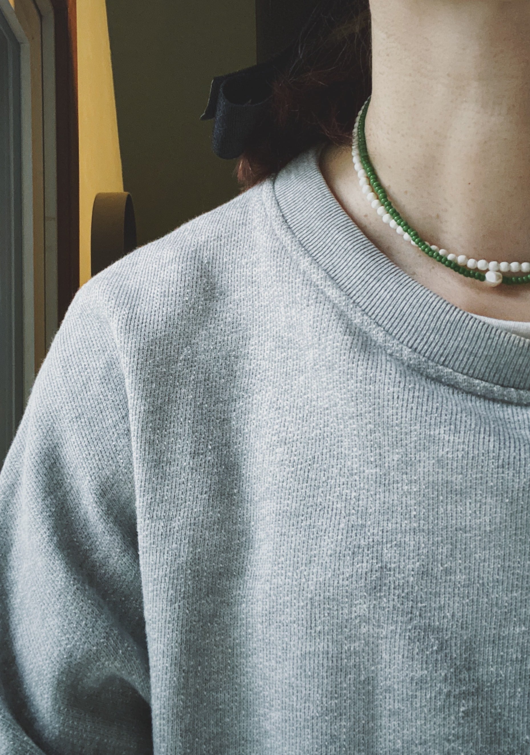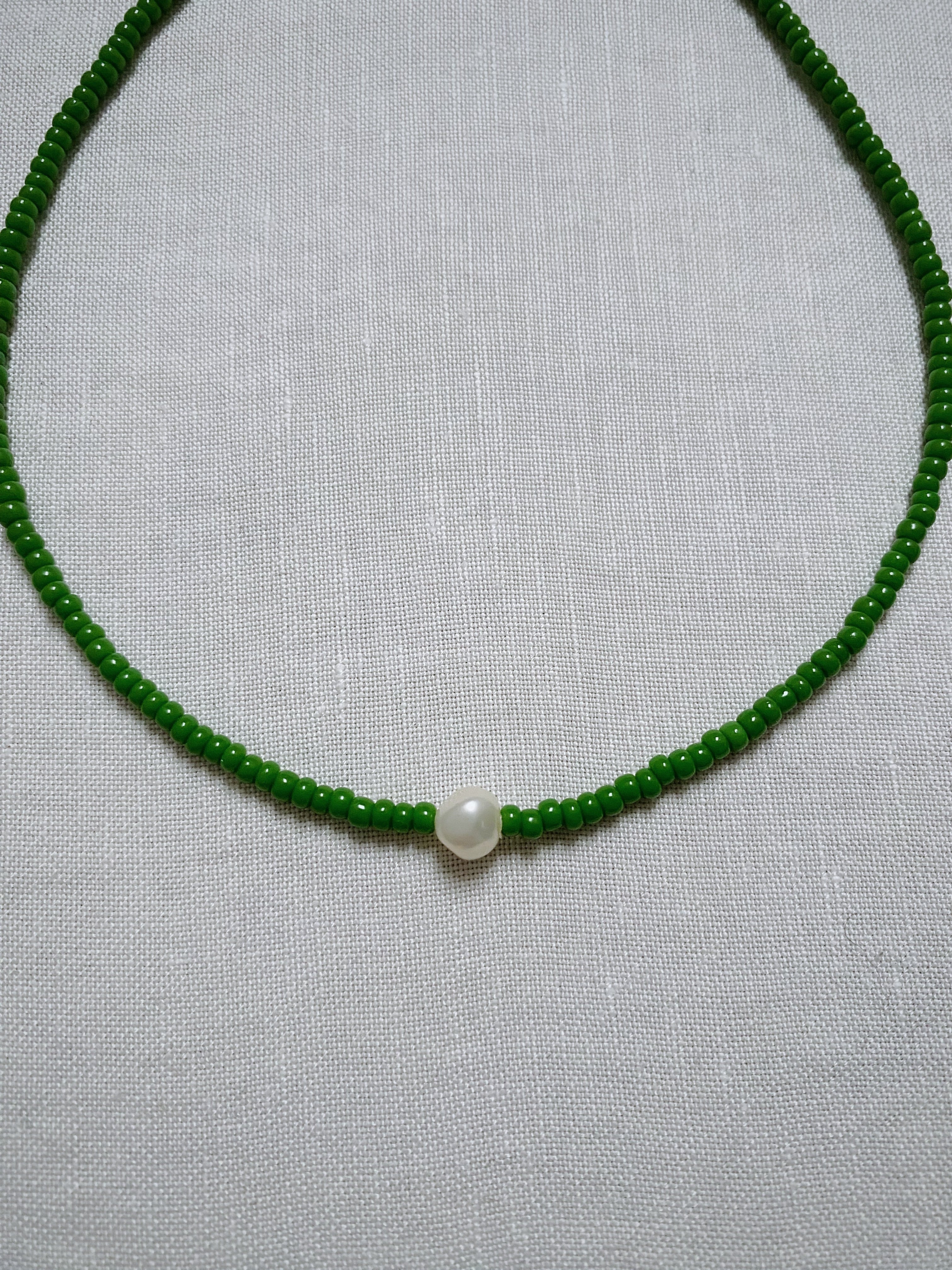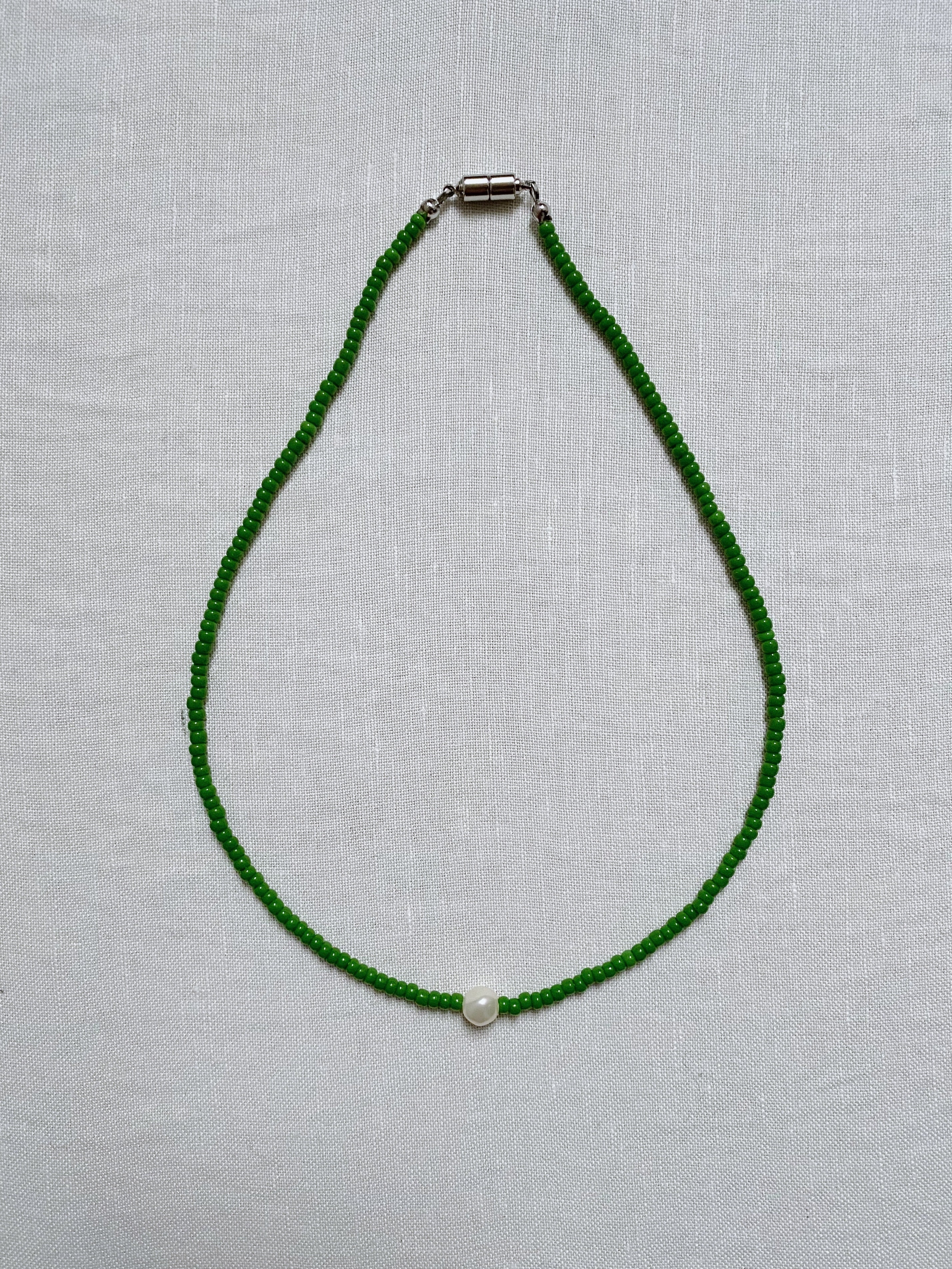 ジャパンビンテージ、とても状態の良いガラスのシードビーズを使用。小さい粒々のネックレスはセンターにパールが一粒。