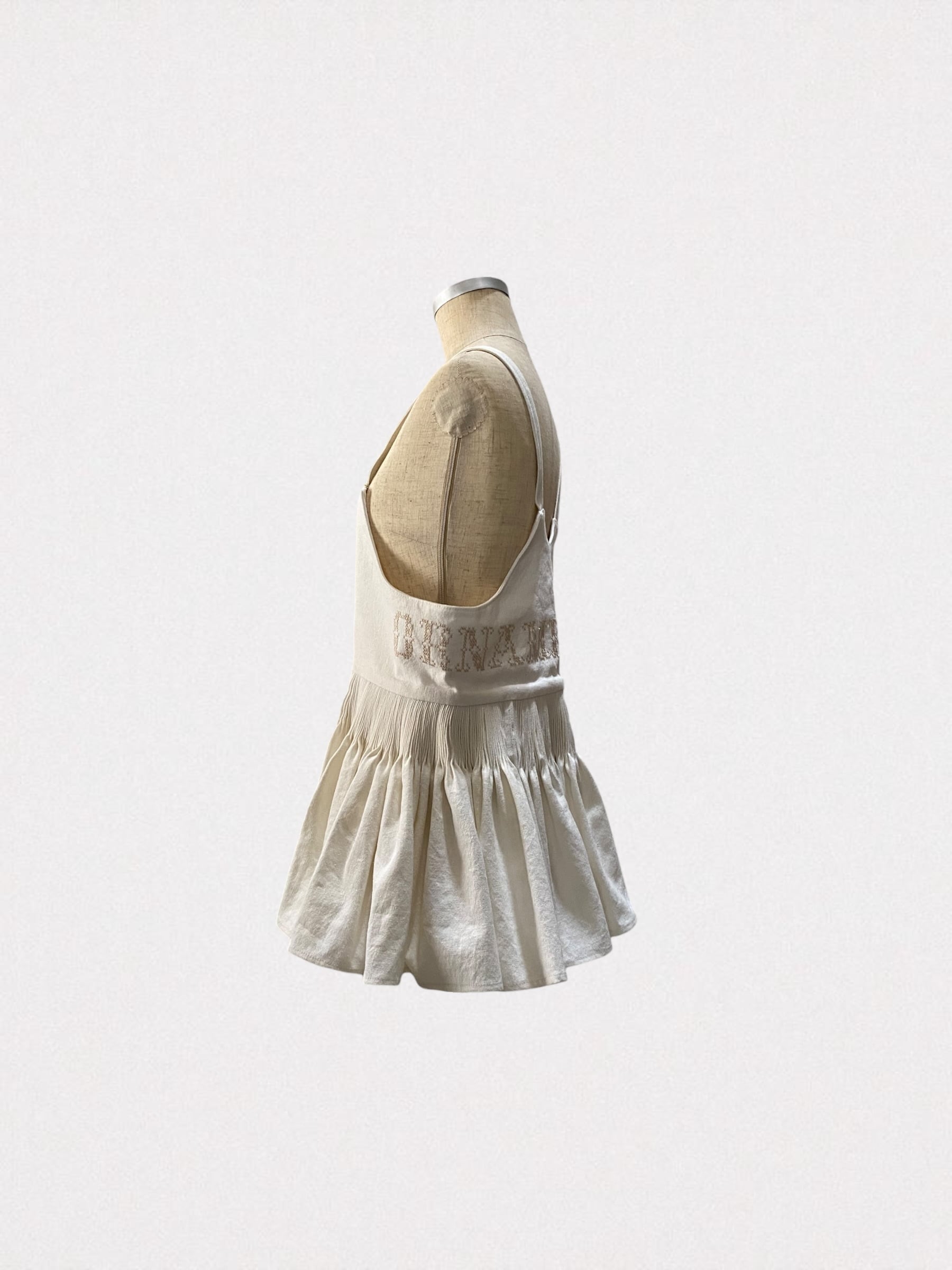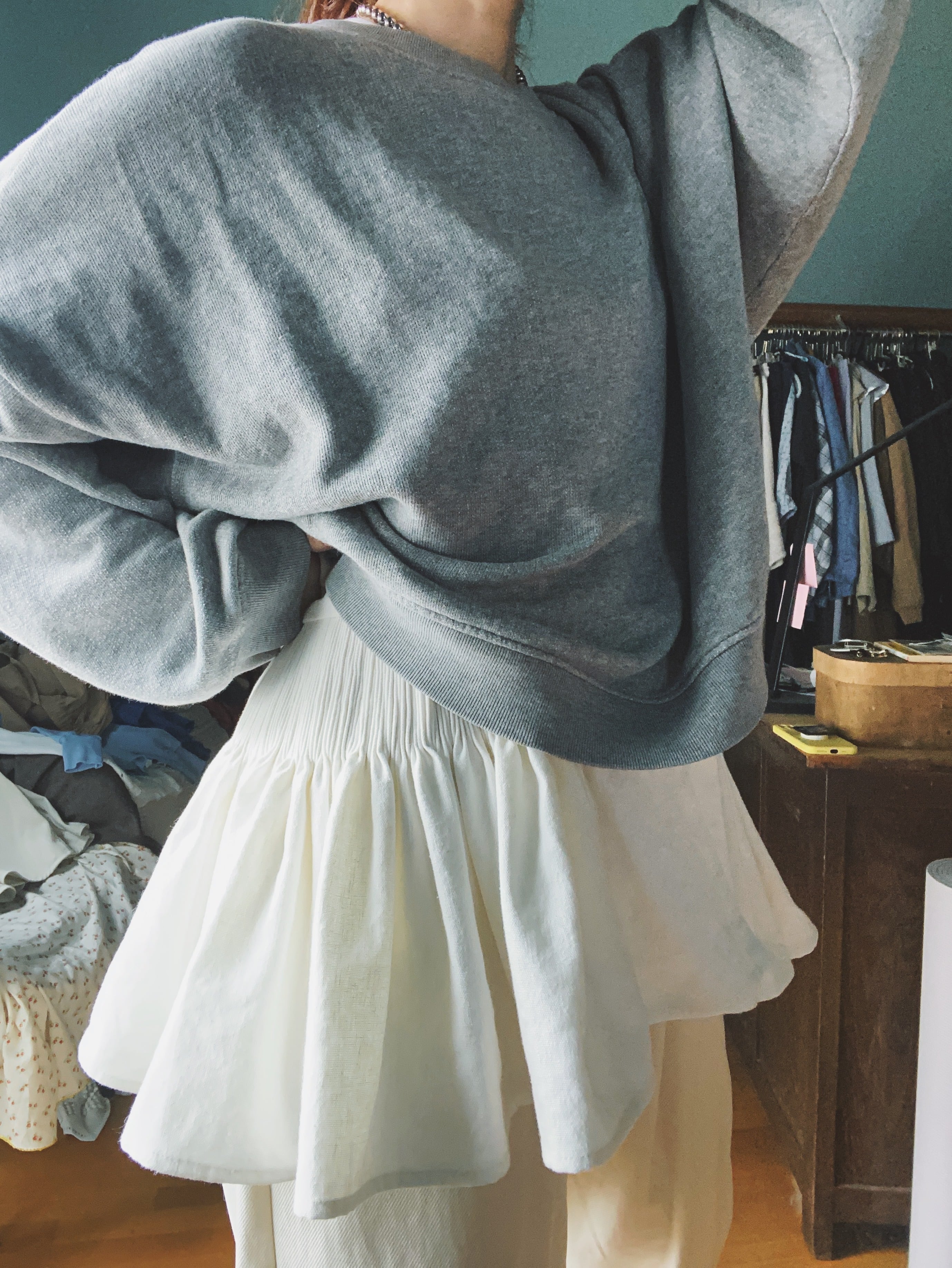 tutu / WHITEは、ビンテージのような生地感と手仕事によるギャザーが魅力の特別なアイテムです。そのほどよい肉厚な生地はしっとりと身体によりそい、上品な着心地。シンプルながらも存在感のあるデザインです。