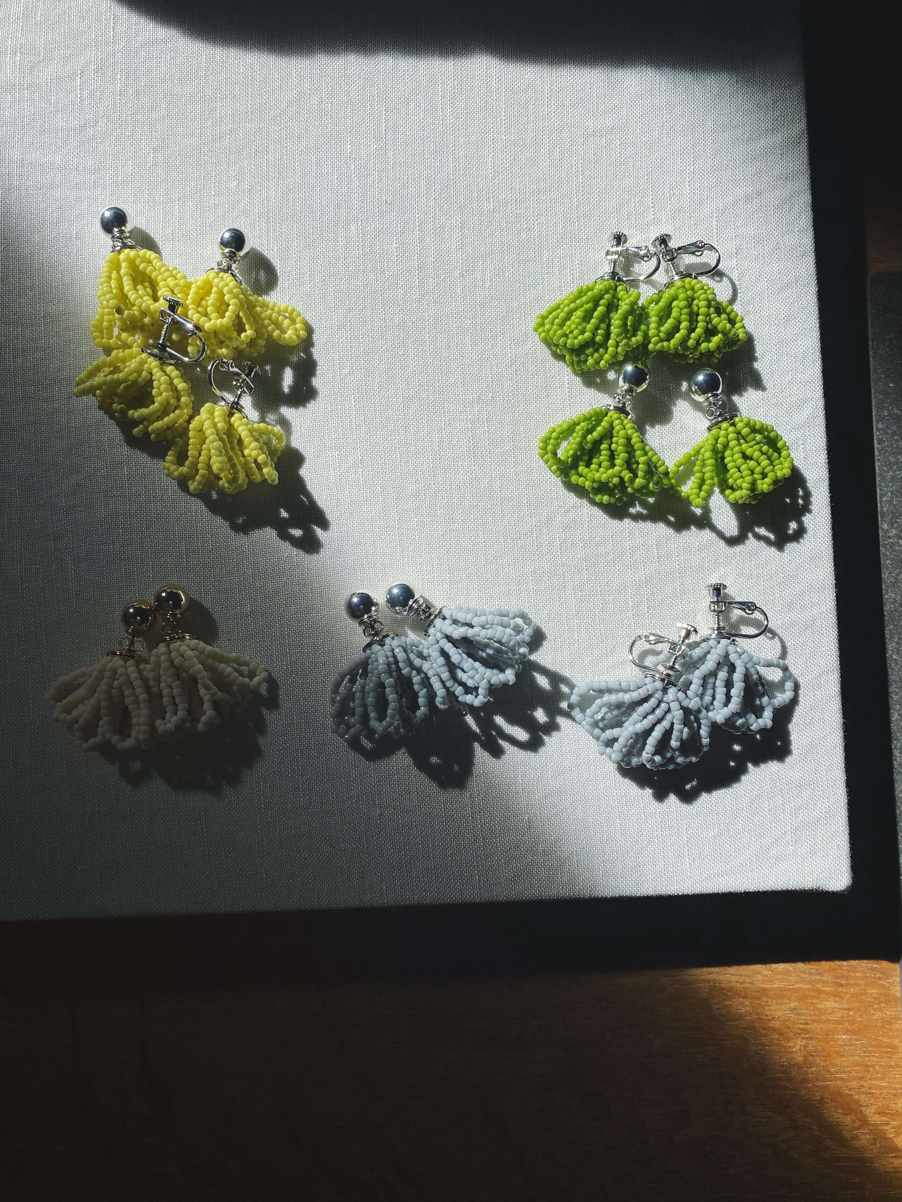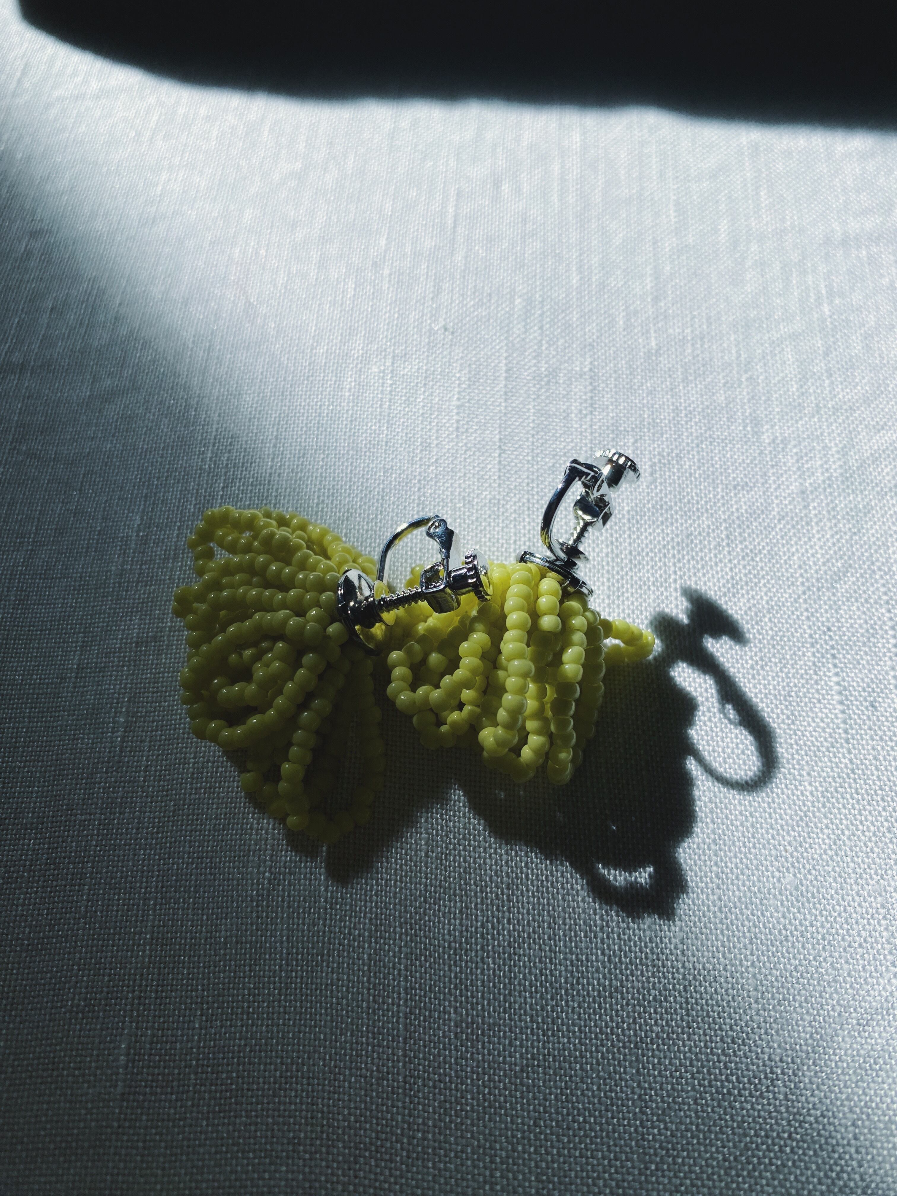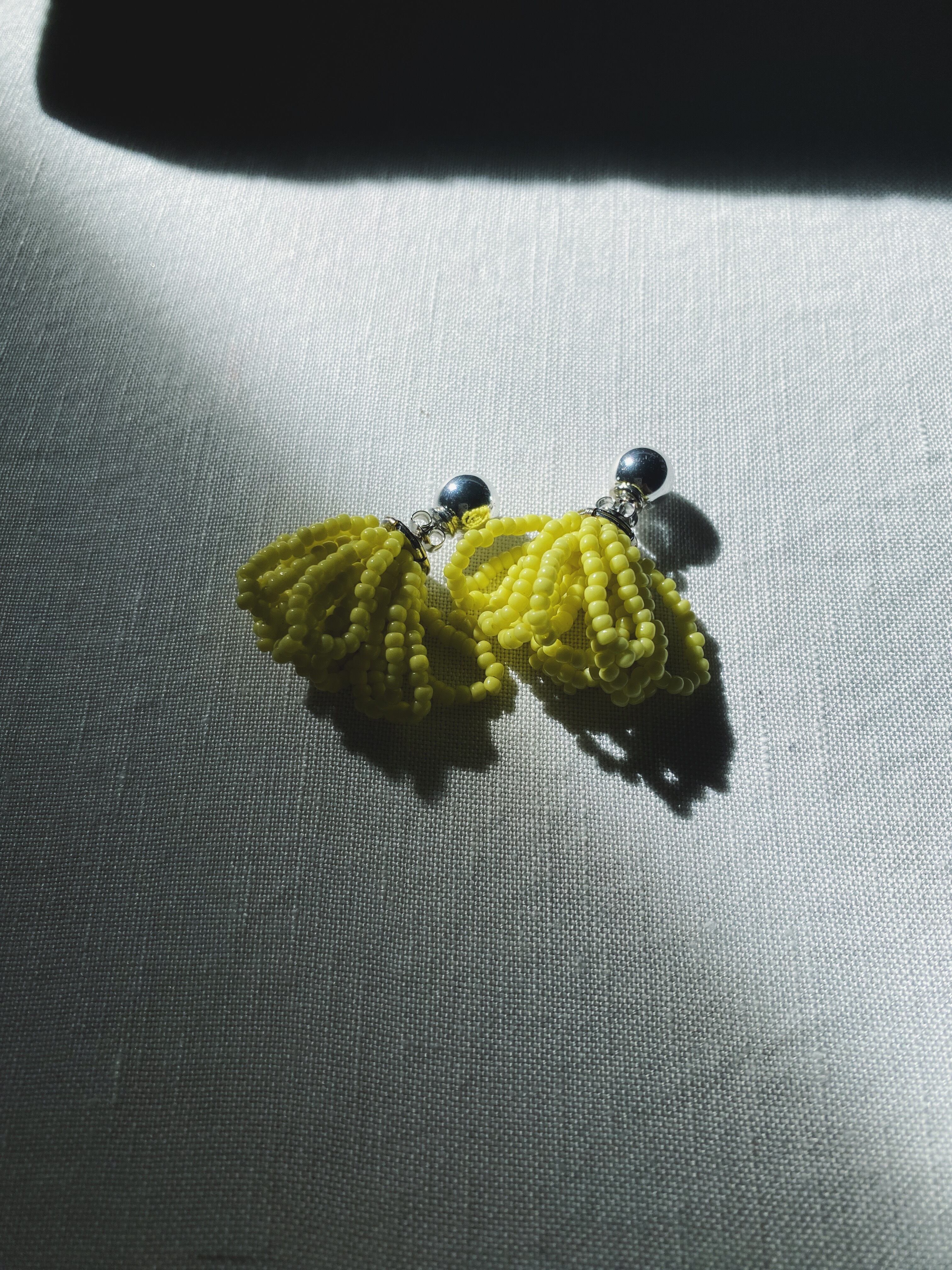 ほんの少しみどりがかったイエローはイタリアのアンティークシードビーズ。